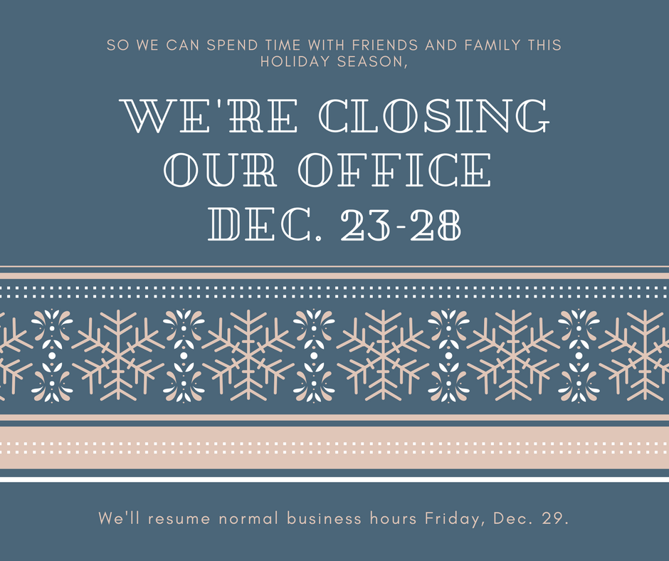 We will be out of the office Dec. 23-28 and will resume normal business hours Friday, Dec. 29.