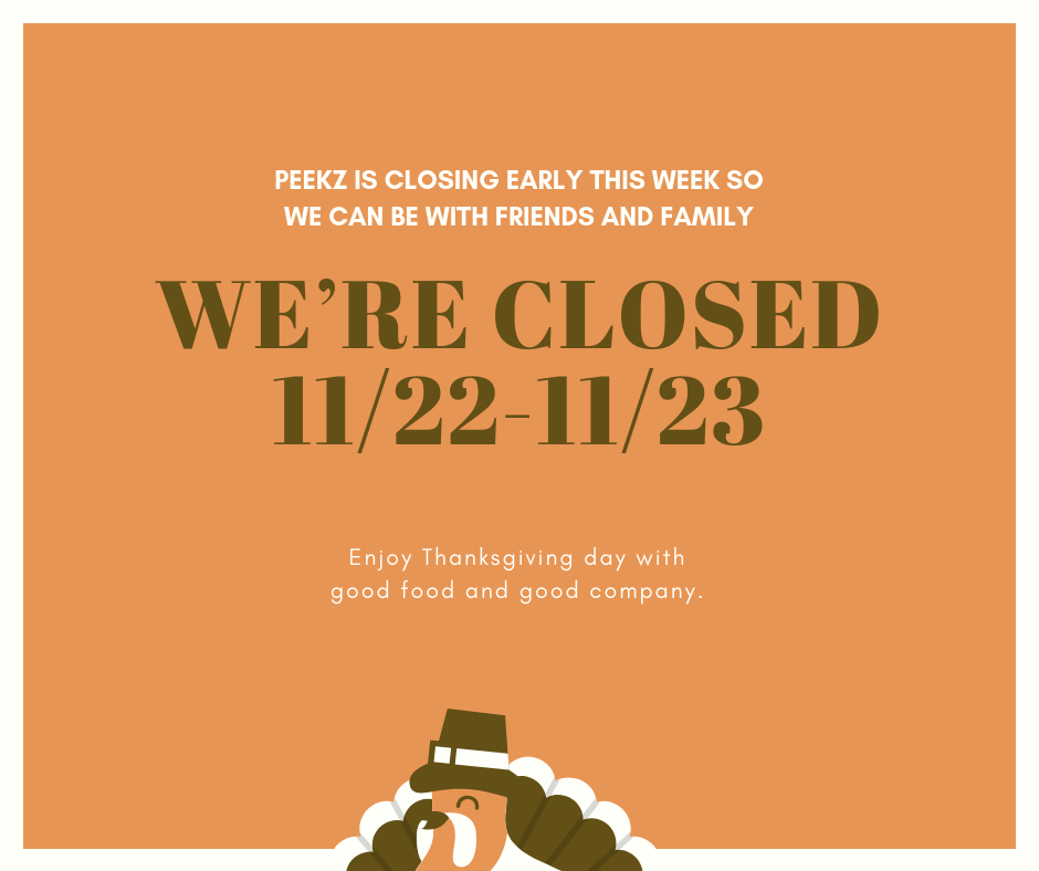 We can’t wait to gobble with friends and family this Thanksgiving. And we hope you will, too! We will be out of the office Nov. 22-23 for the holiday and will resume normal business hours on Monday, Nov. 26. Peekz ConsultiN wishes you and your loved ones a happy Thanksgiving! Peekz ConsultiN LLC is a … Continue reading Peekz closes its office for Thanksgiving